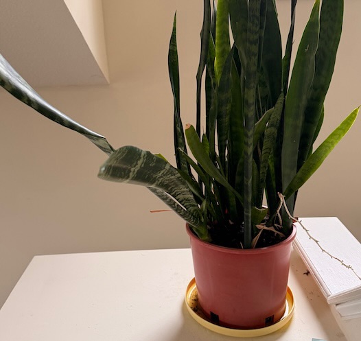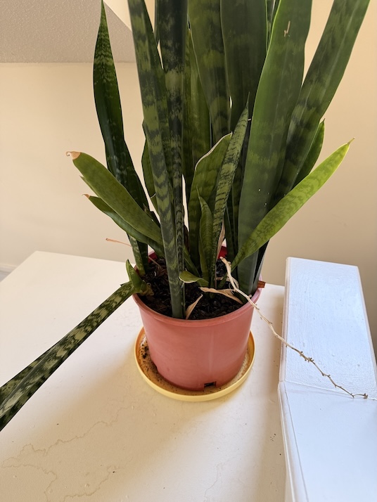 Earlier, I showed a photo of my snake plant with a couple of leaves that mysteriously collapsed overnight. I was going to trim those leaves off, but over the following days, they are slowly making a comeback! Here is its current status: